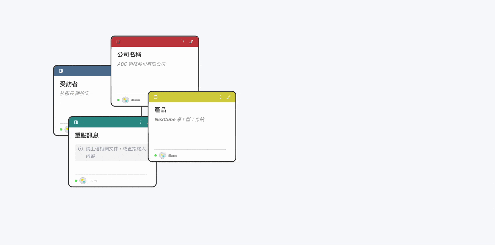 - 準備採訪素材: 在卡片上填入公司名稱、重點訊息、預計曝光的產品或服務、以及受訪者資料。您也可以新增其他卡片,填入本次受訪主題或潛在敏感問題,讓 AI 為您打造更全面的提問環節。