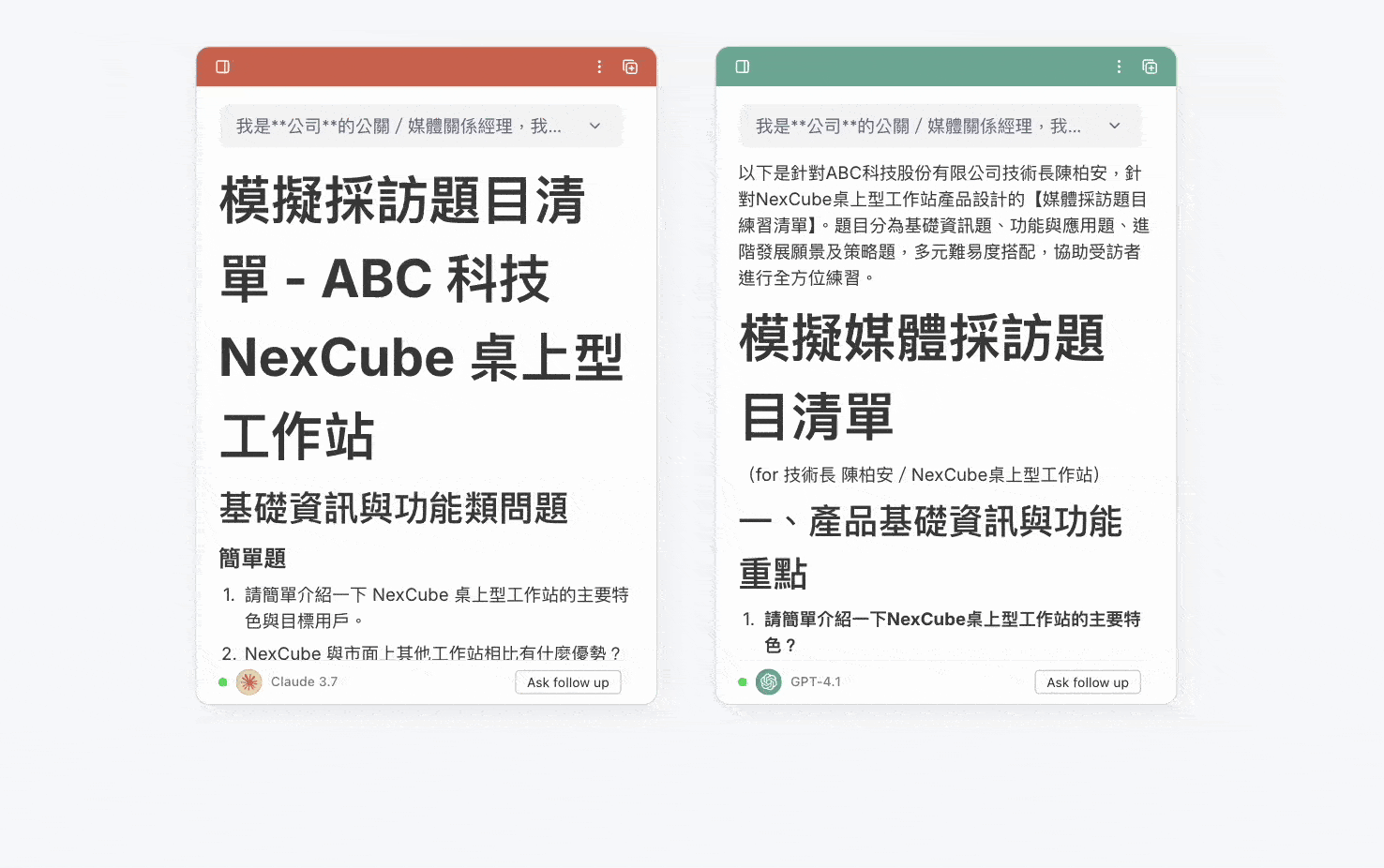 - 連結提示卡 (Prompt Card): 將所有準備好的素材連結至提示卡,讓 AI 能夠全面掌握採訪情境與受訪者立場。