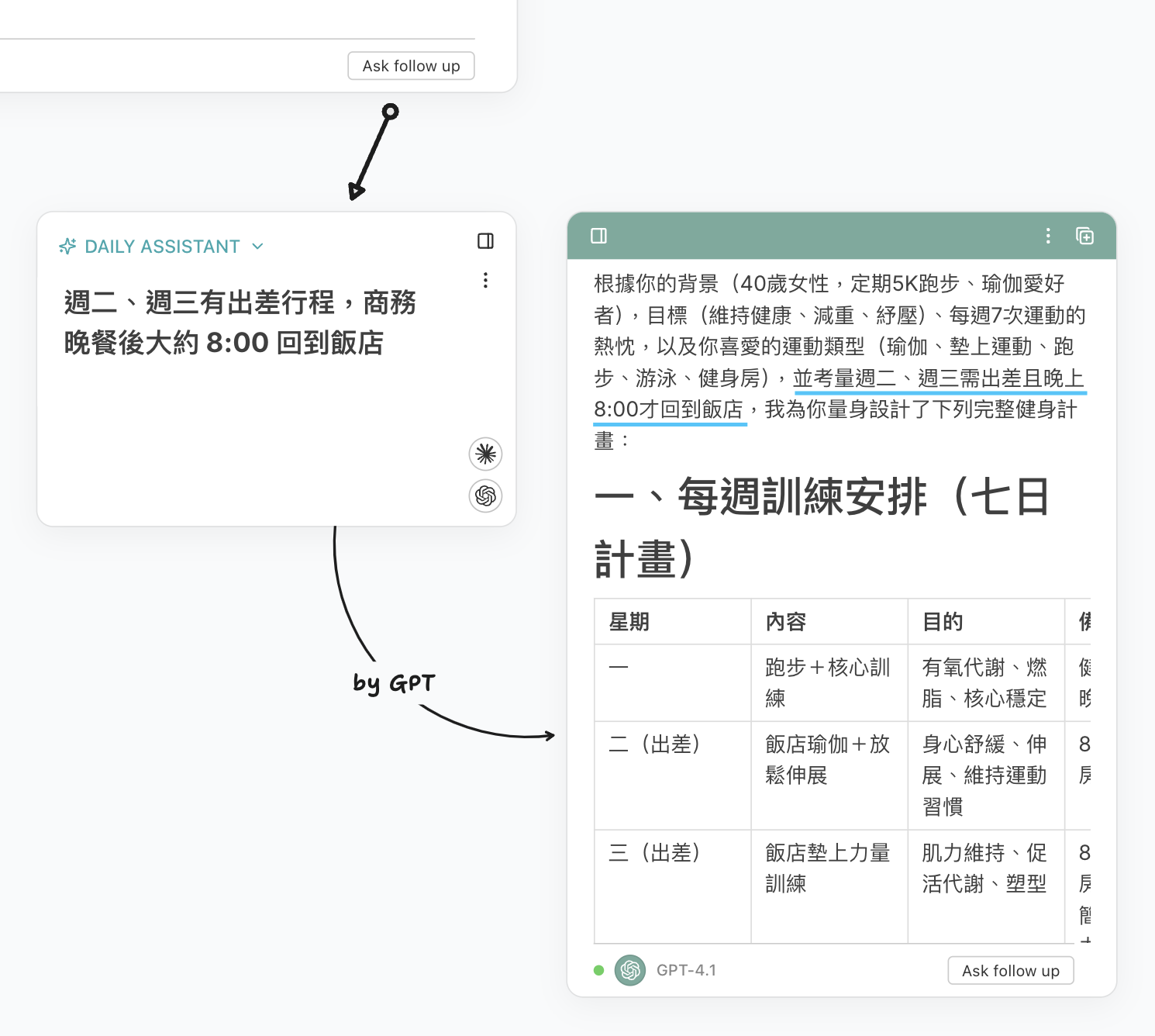 ➊ 突然想起下週有出差行程?你可以點選答案卡 (Preprint Card) 右下方的 Ask follow up,連結一張新的提示卡,請 AI 協助調整運動計畫。