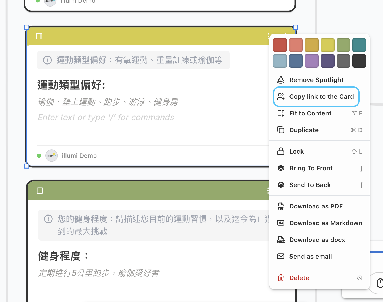 3. 連結提示卡 (Prompt Card): 將所有個人相關卡片連結至範例提示卡,幫助 AI 充分理解你的需求,全方位打造專屬方案。