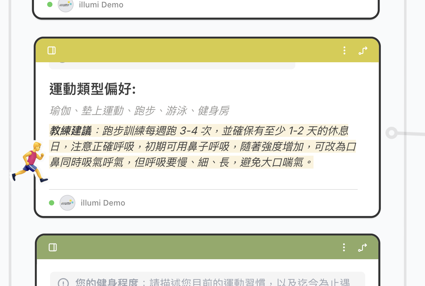 2. 輸入個人狀況與喜好: 在卡片上記錄你的運動類型偏好、期望成果、可用時間、身體狀況等,讓計畫更貼近你的生活節奏。