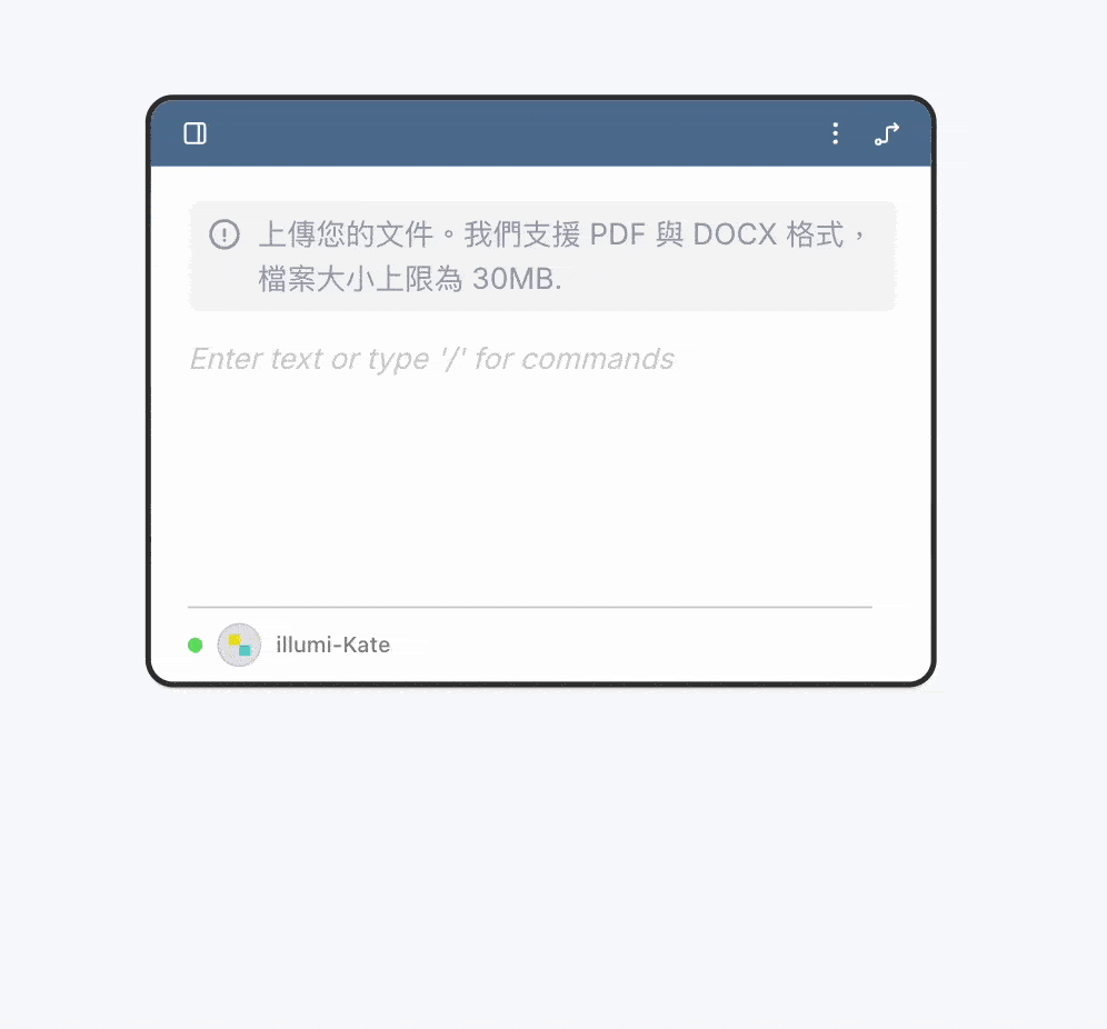 - 你可以匯入檔案、圖片,或編輯文字內容。illumi 目前支援 PDF 與 DOCX 檔案格式,檔案大小上限為 30MB。