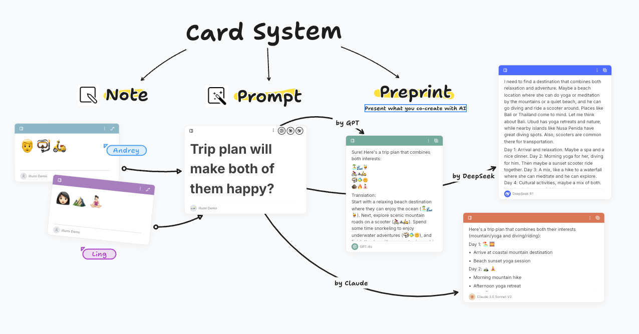 As you know, illumi is building a collaborative whiteboard where you can work with your real and virtual teammates (aka AI) in real time. At the heart of illumi's whiteboard lies our strategically designed card system. Today, let me take you behind the scenes of how we developed these three essential building blocks: Notes, Prompts, and Preprints.
