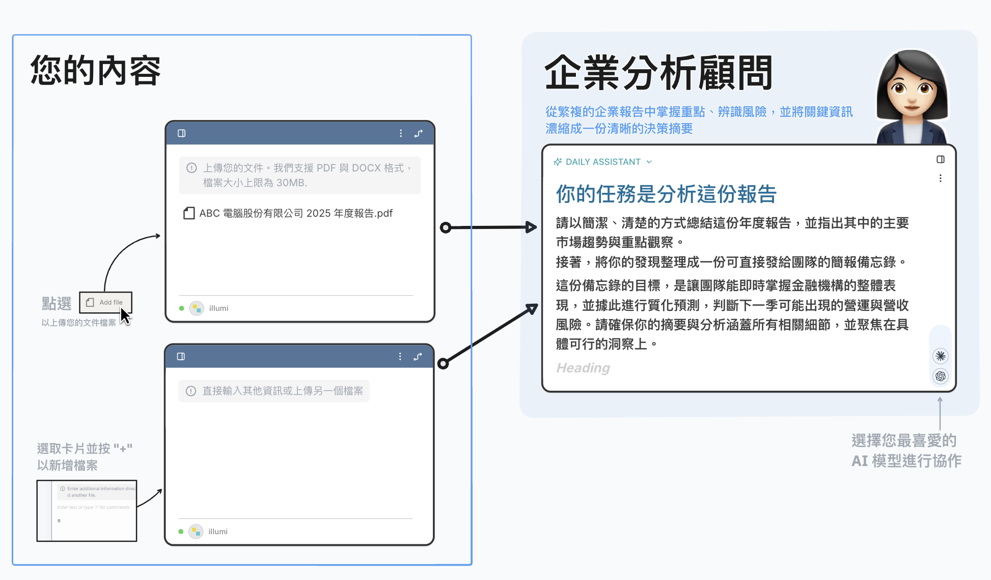 從繁複的企業報告中掌握重點、辨識風險,並將關鍵資訊 濃縮成一份清晰的決策摘要
